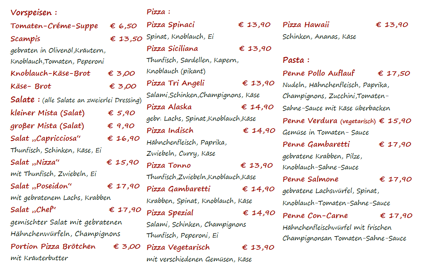 Wir bieten unseren Gästen einen Abholservice mit folgender Karte an: